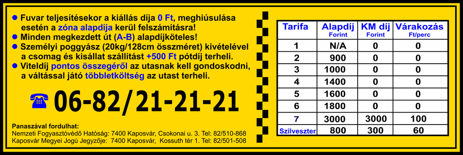 Továbbá megszüntetésre került a fix tarifa használata, mivel úgy véljük, ezen árképzés nem tükrözi egyértelműen a korrekt viteldíj megállapítását. Sok esetben a fix tarifából adódóan indokolatlan többletköltséget ró az utazó közönsére, ezáltal megkárosítva azokat.Továbbra is ingyenes a kiállás egy megadott címre, viszont a rendelés visszamondása esetén, amikor a taxi címhez tart, kötelező az "Alap" + "Km" ár megtérítése.